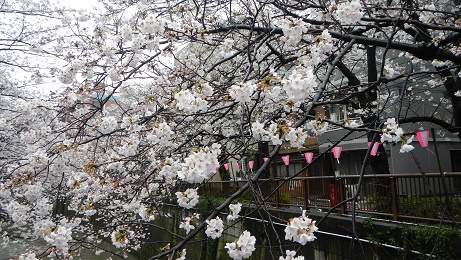 今年は目黒川のお花見は雨でした。満開の週末はお昼時にはまだ人もまばらで提灯が雨に濡れて風情のある川沿いに水車があることに気が付きました。昔、川へ流れていた湧き水で回していた水車を記念に作られた小さな飾り水車です。都会でも桜は綺麗ですね。