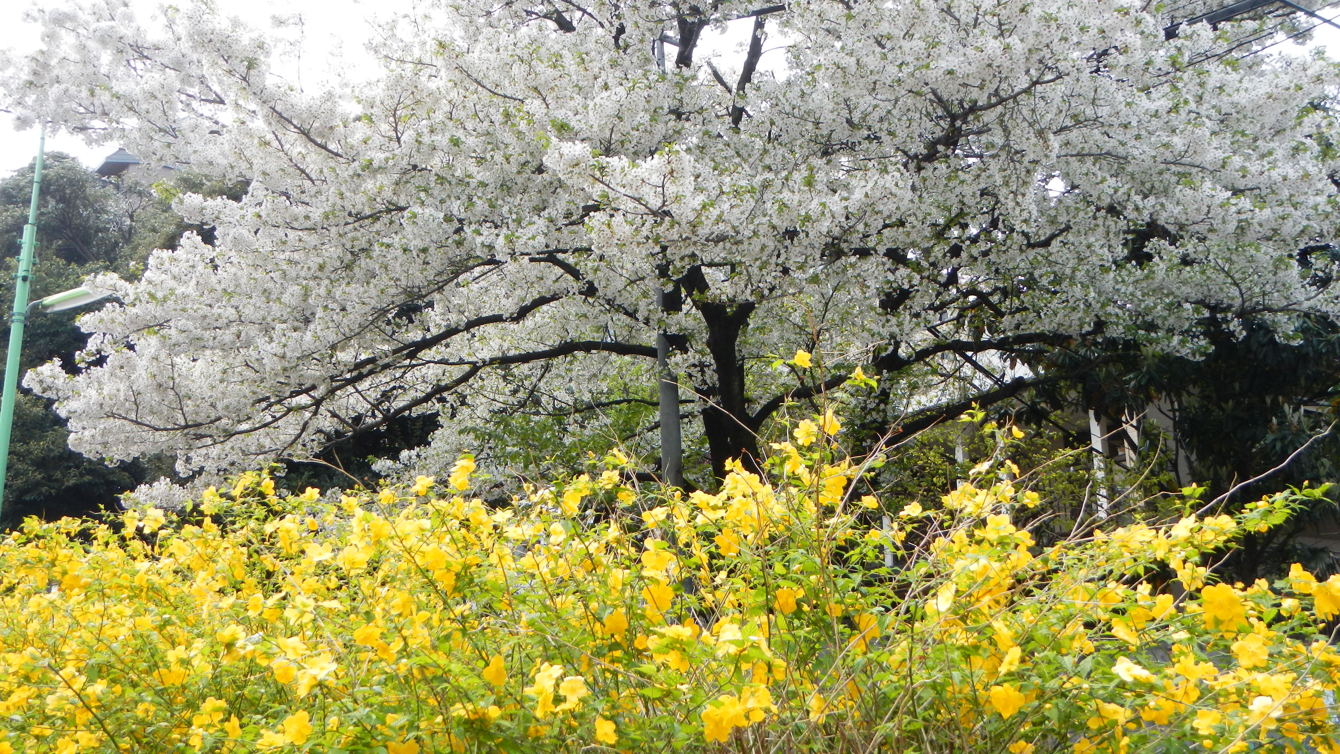 三宿の遊歩道は、人口の小川や滝があり、その両脇の桜がとても美しいです。三軒茶屋では、蛇崩遊歩道の隣家から伸びる桜が山吹の黄色に映えて都会とは思えない風情でしたし、すぐ隣の庭でも小鳥の囀りを隠して桜が満開に咲き誇っていました。