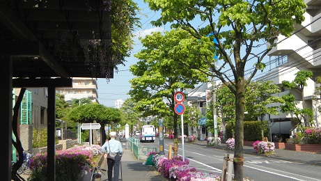 郵便局の帰り道、弦巻通りへと遠回りしてみました。藤棚が綺麗なので、地元では有名な弦巻のバス通りです。歩道にいくつもの藤棚が点在していて、緑が爽やかな街路樹の合間に藤の花が咲いていました。少し散り始めていて、花の紫が枯れかかって来ています。その下に今はつつじが満開。