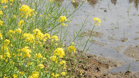 のどかな田園風景・・・田植えのすんだばかりの田んぼ道には菜の花や豆の花が咲いていました。