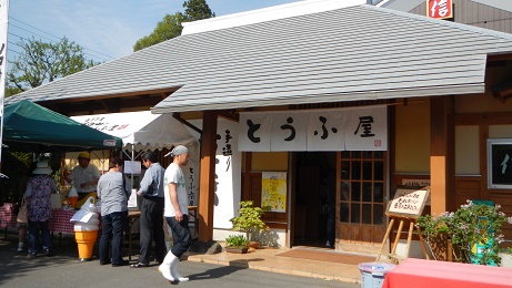 駐車場からメイン会場までかなりありました。まず、目印がお豆腐屋さん。賑わってましたね。そしてその先の曲がり角を坂道の方へ曲がり