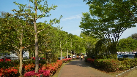 この時期はぎっしりと咲き誇るつつじの花の歩道がどこまでも続いています。